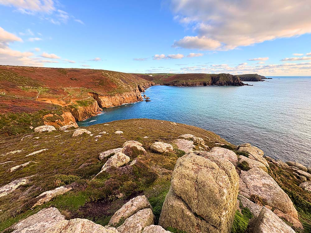 As you climb northwards towards the old coastguard lookout, the coastline unfolds dramatically. Longships Lighthouse appears offshore, standing guard over the rocks, and on a clear day you can even make out the faint outline of the Isles of Scilly on the horizon. Having visited the islands before, I know how different life feels out there, how still and quiet the world becomes, and seeing them again from these cliffs always gives me a sense of longing. These cliffs themselves are extraordinary. Pure granite, rough, harsh, weathered and covered in lichen. I have climbed here for years, and they never stop feeling wild and untamed. It is the perfect combination when you want to escape the noise of normal life: a stretch of coastline that feels like the end of the world, paired with some of the most powerful geology in Cornwall.