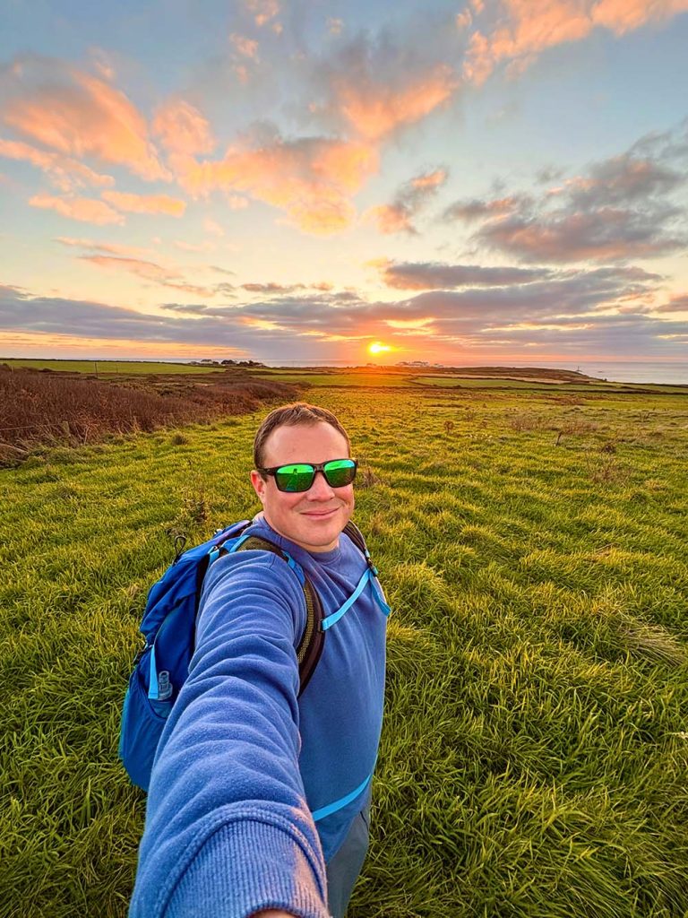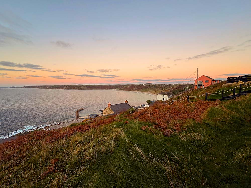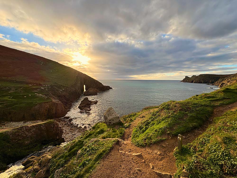 From Nanjizal, the path climbs steeply out of the cove. It is a proper leg-burner, but once you reach the top the walking becomes much easier. The inland stretch is a gentle journey back across farm fields towards Sennen. You pass through Trevescan and the Land’s End Camping and Glamping site before the path guides you back over the final fields. If you time the walk for late afternoon, you will be met with another breathtaking sight: the sun sinking directly into the ocean beyond Longships Lighthouse. With no land ahead of you, it is pure magic. The entire sky glows, the lighthouse silhouette stands proud in the distance, and the day ends in a way only the far west of Cornwall can offer.