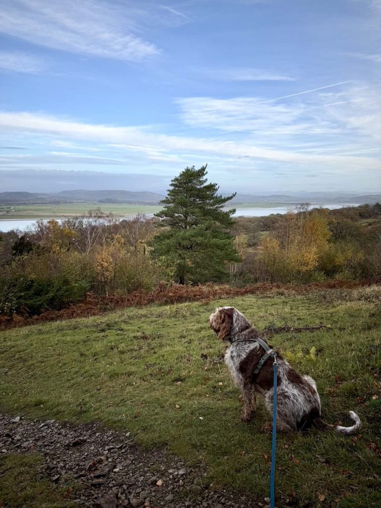 He’s a big fan of woodland, loves to snuffle through bracken and undergrowth. He’ll head for water if there is any and will paddle in the shallows happily for as long as we let him, but he doesn’t swim, which is unusual for his breed. That said, if there’s high ground, he wants to conquer it! He’ll willingly keep going up until he can go no further, and then adopts his ‘summit stare’, where he’ll gaze out across the landscape, loving the breeze, and all the scents it brings his way.